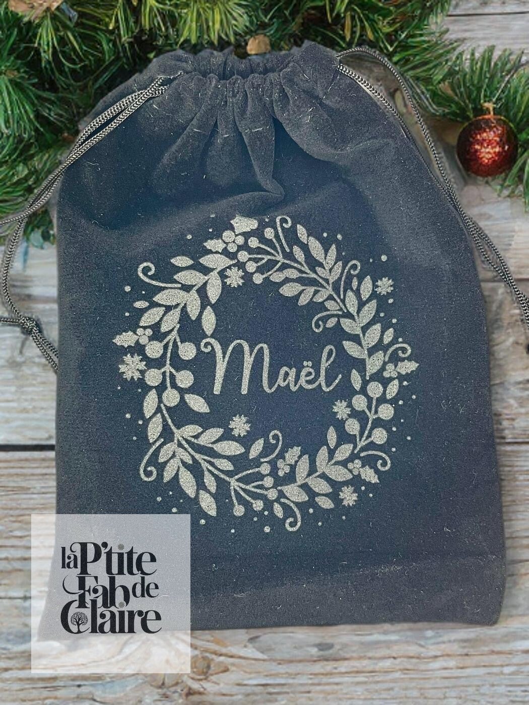 Pochon en velours gravé avec le prénom et la couronne choisie pour la boule en verre.