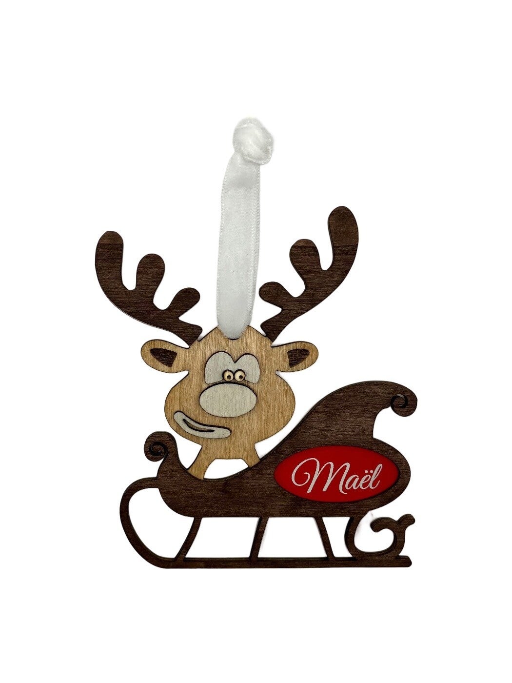Suspension renne personnalisée sur traîneau – Prénom gravé – Déco de Noël unique