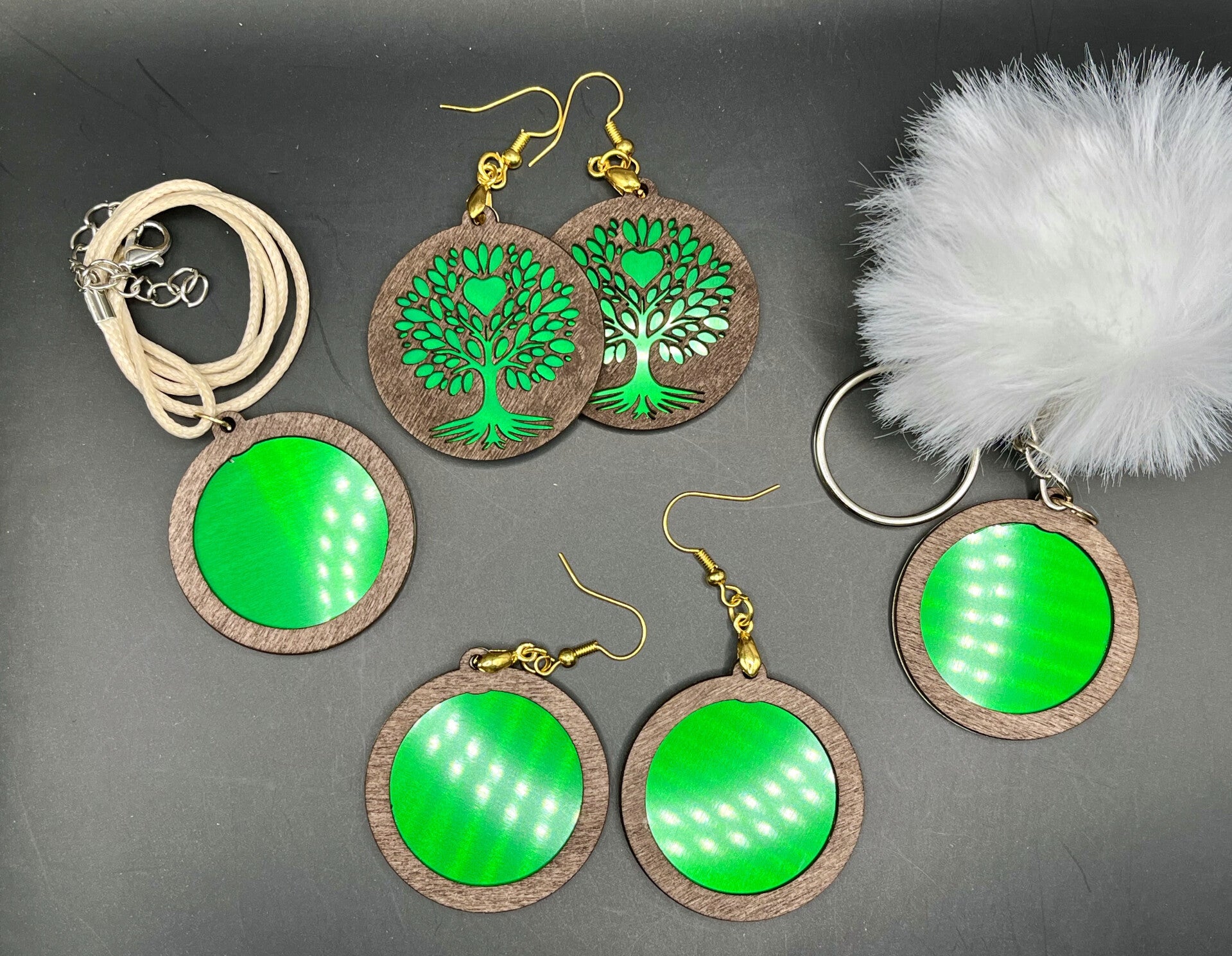 Ces créations personnalisables – boucles d’oreilles, collier ou porte-clés – allient la chaleur du bois découpé au laser à la finesse de l’acier inoxydable et du PU similicuir.