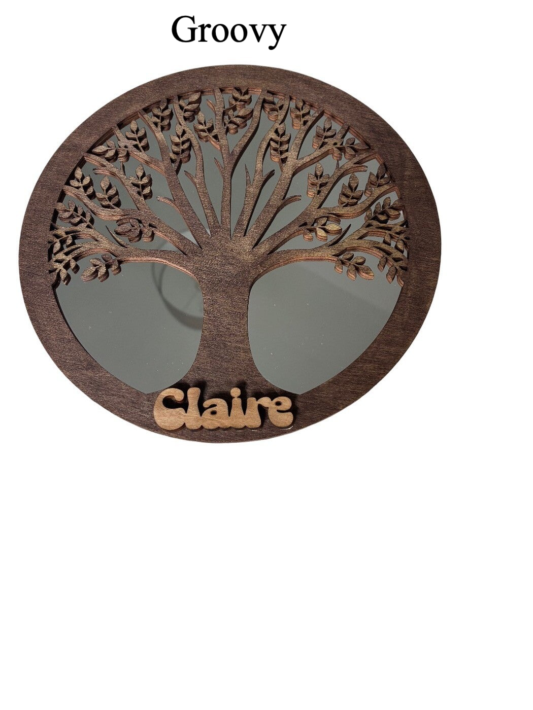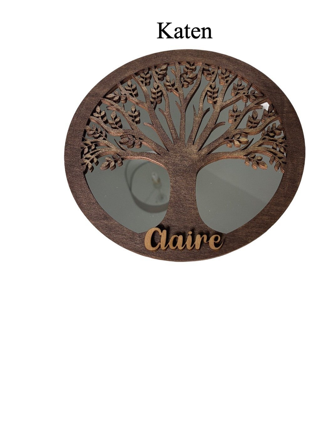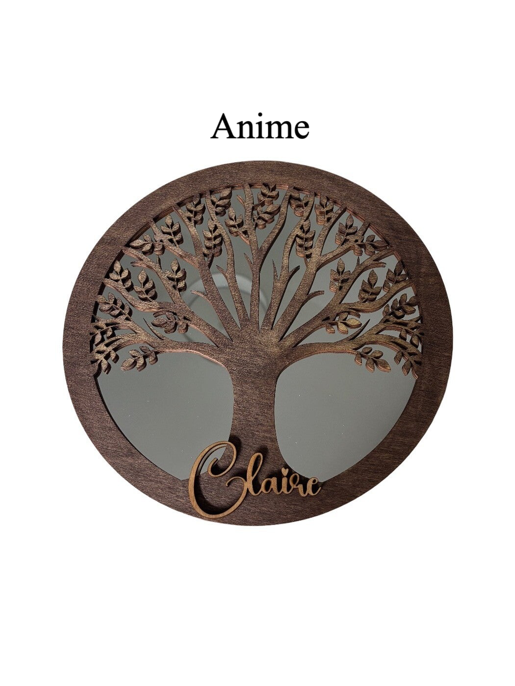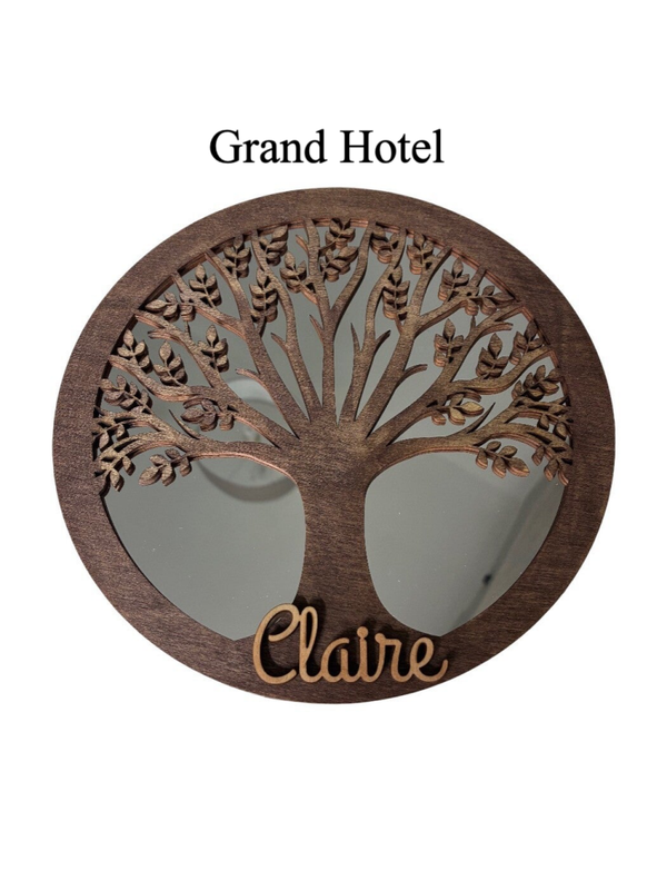 Miroir décoratif Arbre de Vie personnalisé en acrylique léger et bois découpé au laser. Son effet miroir artistique apporte lumière et profondeur à la décoration intérieure. La personnalisation avec un prénom offert en fait un cadeau unique pour anniversaire, naissance ou fête.