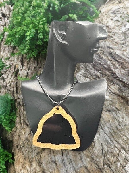 Collier Triquetra en bois découpé au laser et acier inoxydable hypoallergénique. Léger et confortable, il est personnalisable (+1€) avec un prénom, un mot ou un symbole pour créer un bijou unique et symbolique.