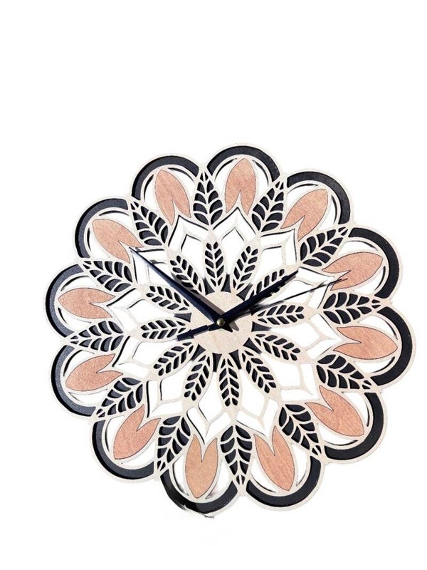 Horloge mandala feuilles bois de tilleul 30 cm – Artisanale et silencieuse