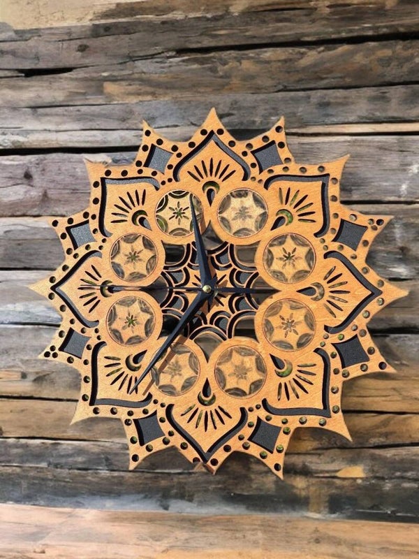 Apportez charme et authenticité à votre intérieur avec cette horloge murale ronde en bois de tilleul, diamètre 30 cm, motif mandala decoupé. Chaque pièce est fabriquée à la main, unique, avec mécanisme silencieux fonctionnant sur 1 pile AA(non fournie). Idéale pour salon, chambre ou bureau, elle combine décoration artisanale et fonctionnalité.